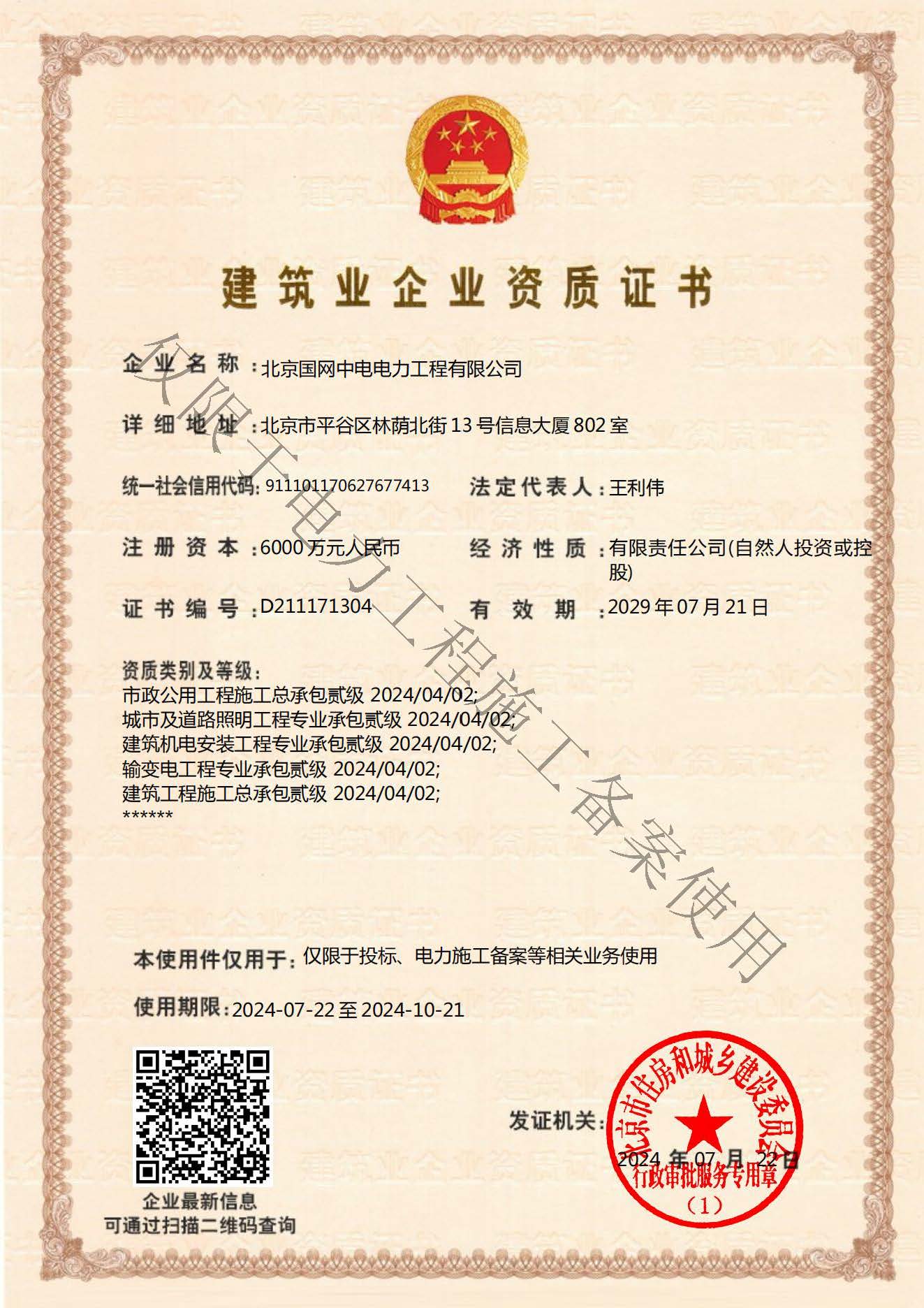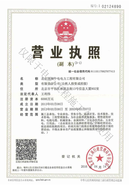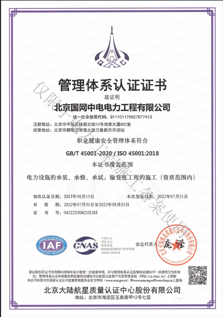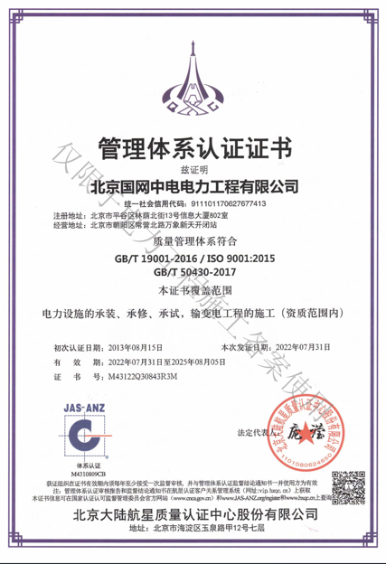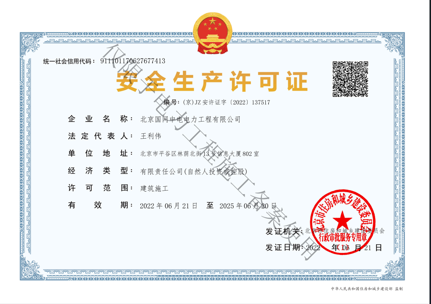 北京國(guó)網(wǎng)中電電力工程有限公司,已取得國(guó)家電監(jiān)會(huì)頒發(fā)的《承裝(修、試)電力設(shè)施許可證》、為電力施工承裝四級(jí)、承修四級(jí)、承試四級(jí)企業(yè)。北京市住房和城鄉(xiāng)建設(shè)委員會(huì)頒發(fā)的房屋建筑施工總承包二級(jí)、機(jī)電設(shè)備安裝工程專業(yè)承包二級(jí)、輸變電專業(yè)承包二級(jí)、城市及道路照明工程專業(yè)承包二級(jí)、市政公用工程總承包二級(jí)資質(zhì)、勞務(wù)不分等級(jí),已通過(guò)ISO9001:2015 GB/T50430-2017質(zhì)量管理體系、GB/T24001-2016/ISO 14001:2015環(huán)境管理體系、